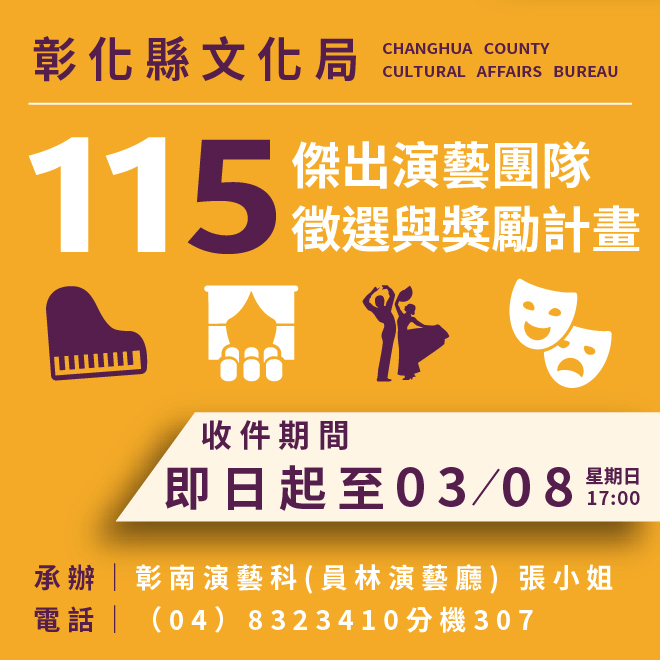 公告日期:115-01-21 ~ 115-03-10報名日期:場次1:115-01-21 ~ 115-03-10活動時間:場次1:115-01-21 ~ 115-03-10活動時間:場次1:即日起至115年3月10日(星期二)17:00止活動地點:場次1:員林演藝廳