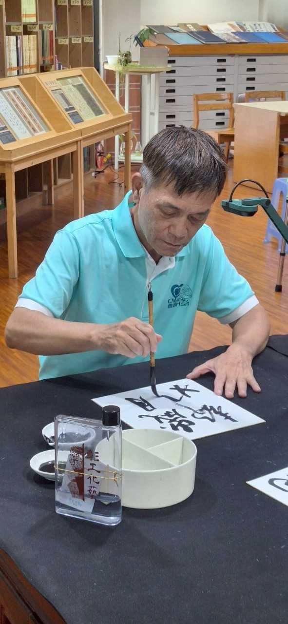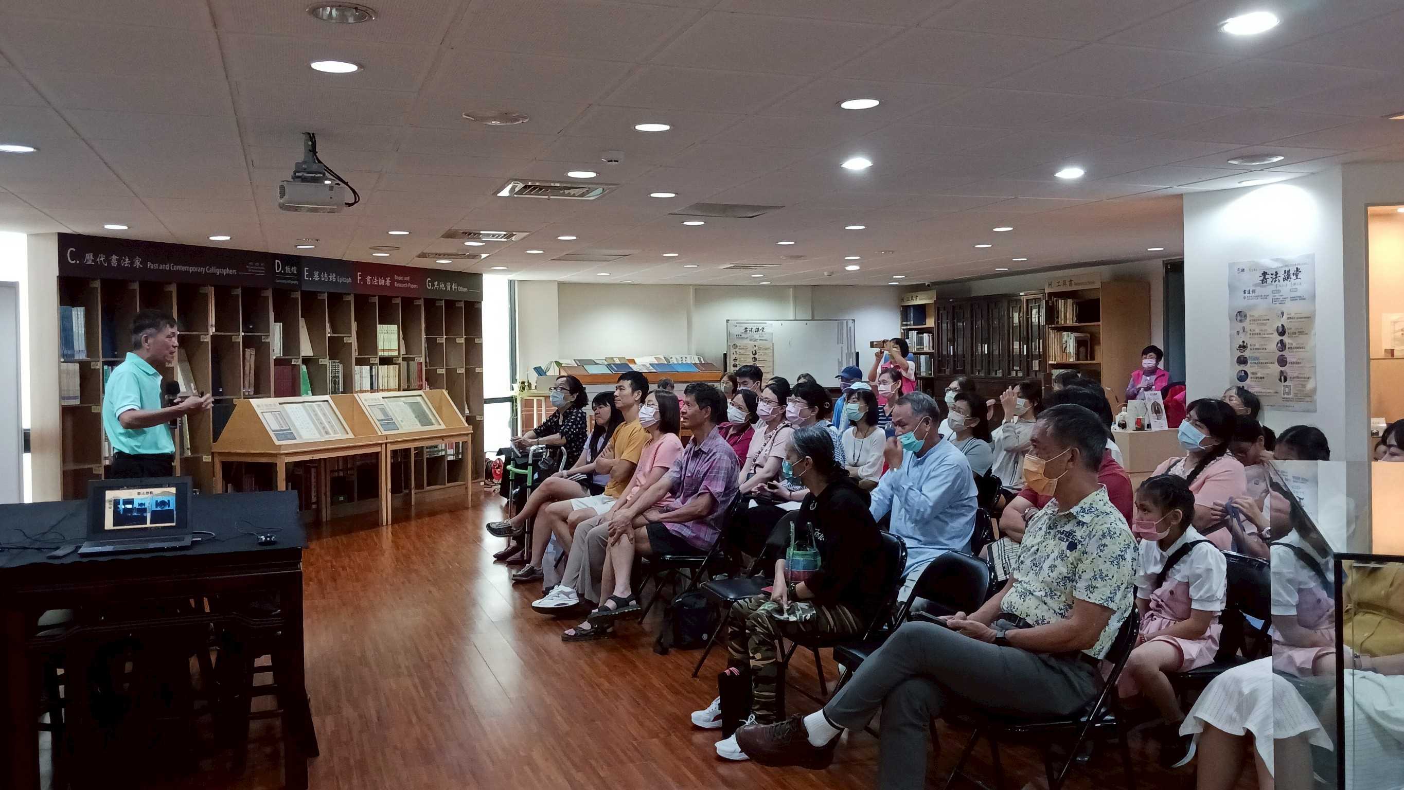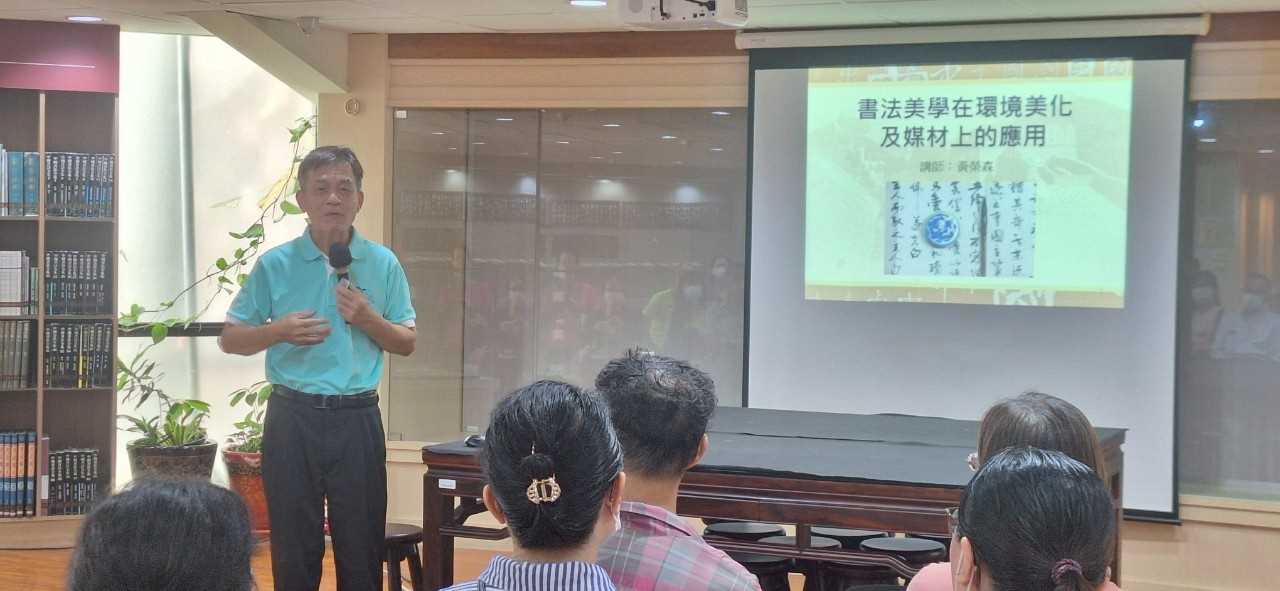 盛夏午後,書道館三樓的書法講堂座無虛席,原本限額 40 名的座位,最終湧入 56 位熱愛書藝的朋友,其中有 8 位是第一次踏進書道館的新朋友,現場氣氛既溫馨又熱絡。本場講座邀請到現任僑信國小校長、磺溪九怪書會前會長黃榮森講師,為大家帶來一場結合美學、環境設計與書法創意的精彩分享——「書法美學在環境美化及媒材上的應用」。