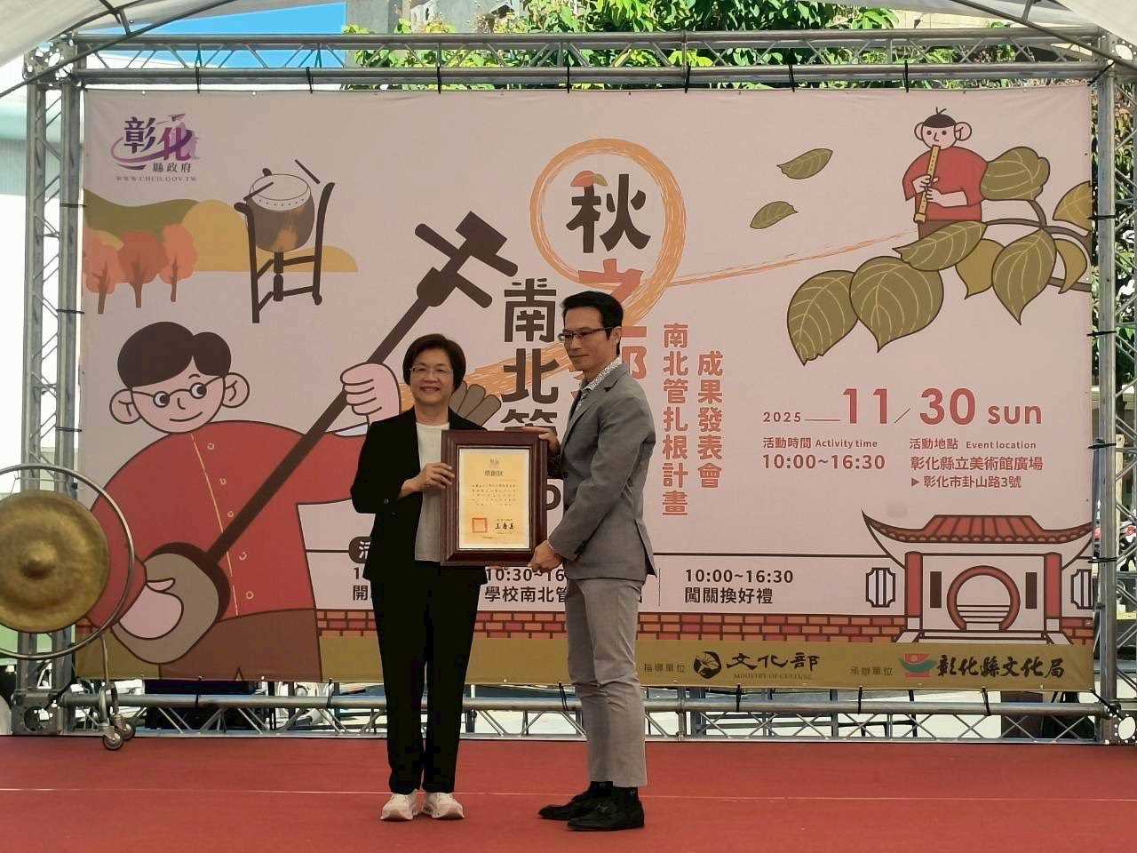 南北管是彰化縣最具在地特色的傳統音樂,彰化縣政府深耕「南北戲曲教育扎根計畫」9年,每年並邀請南北管扎根學校參「南北管秋之饗宴」演出,今年活動於今(30)日在彰化縣立美術館廣場舉辦,共有來自全縣16所學校及彰化縣立青少年南北管實驗樂團共同演出。彰化縣長王惠美親自頒發感謝狀給長期贊助學校南北管教育的財團法人千朝文化藝術基金會董事長陳維仁、積極推動傳統藝術教育的學校王縣長表示,今年的南北管秋之饗宴規模為歷年之最,展現多年來縣內南北管教育的扎根成果與傳承能量,讓民眾在深秋時節聆聽最動人的傳統樂韻。