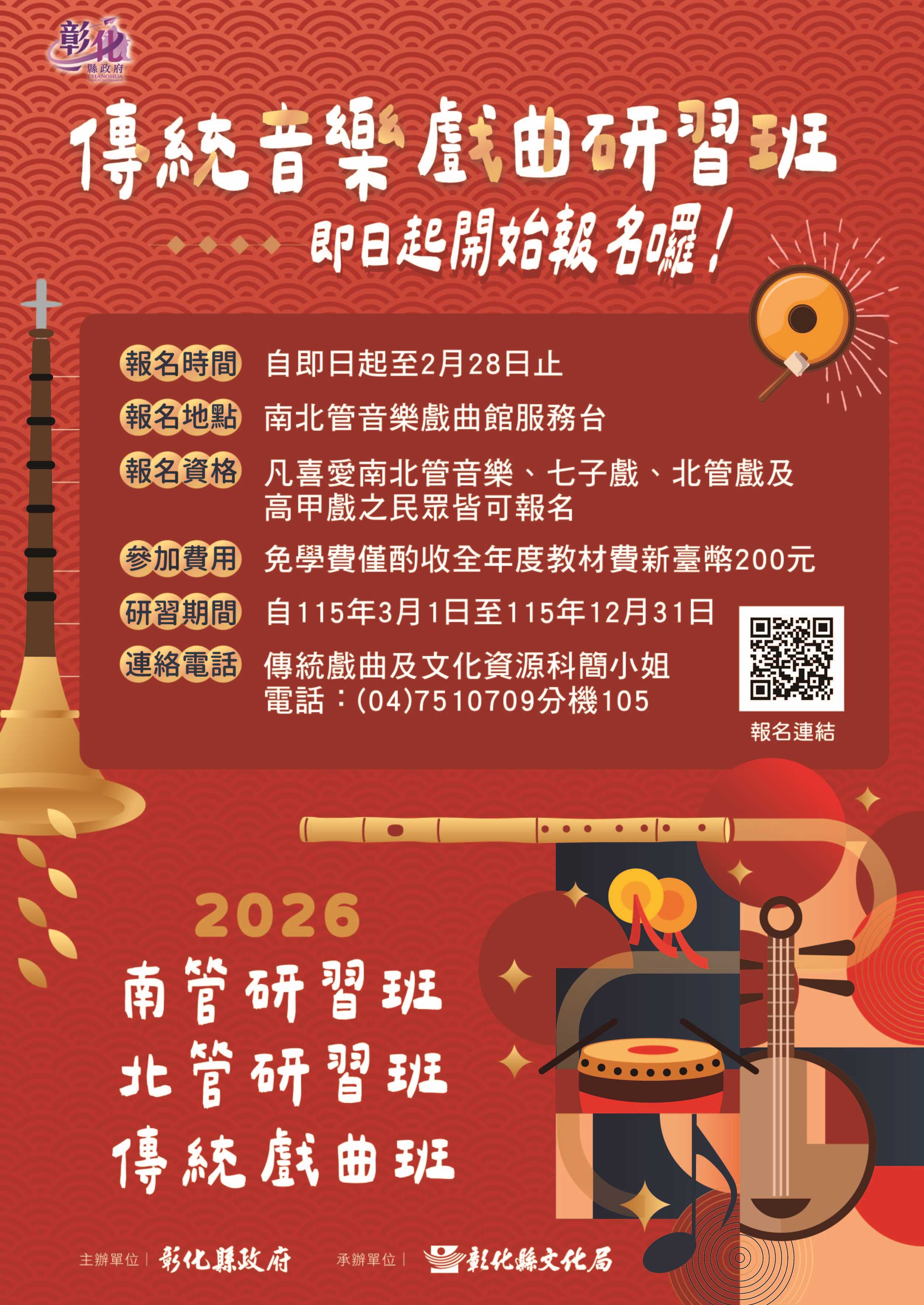 彰化縣長王惠美縣府團隊多年來持續提倡傳統音樂與戲曲藝術,推動「傳統音樂戲曲傳習計畫」。在去年度研習班參與人數明顯成長、反應熱烈的基礎上,彰化縣文化局於115年度持續辦理研習課程,即日起至2月28日止受理報名,誠摯邀請喜愛南北管音樂與傳統戲曲的民眾踴躍參加。