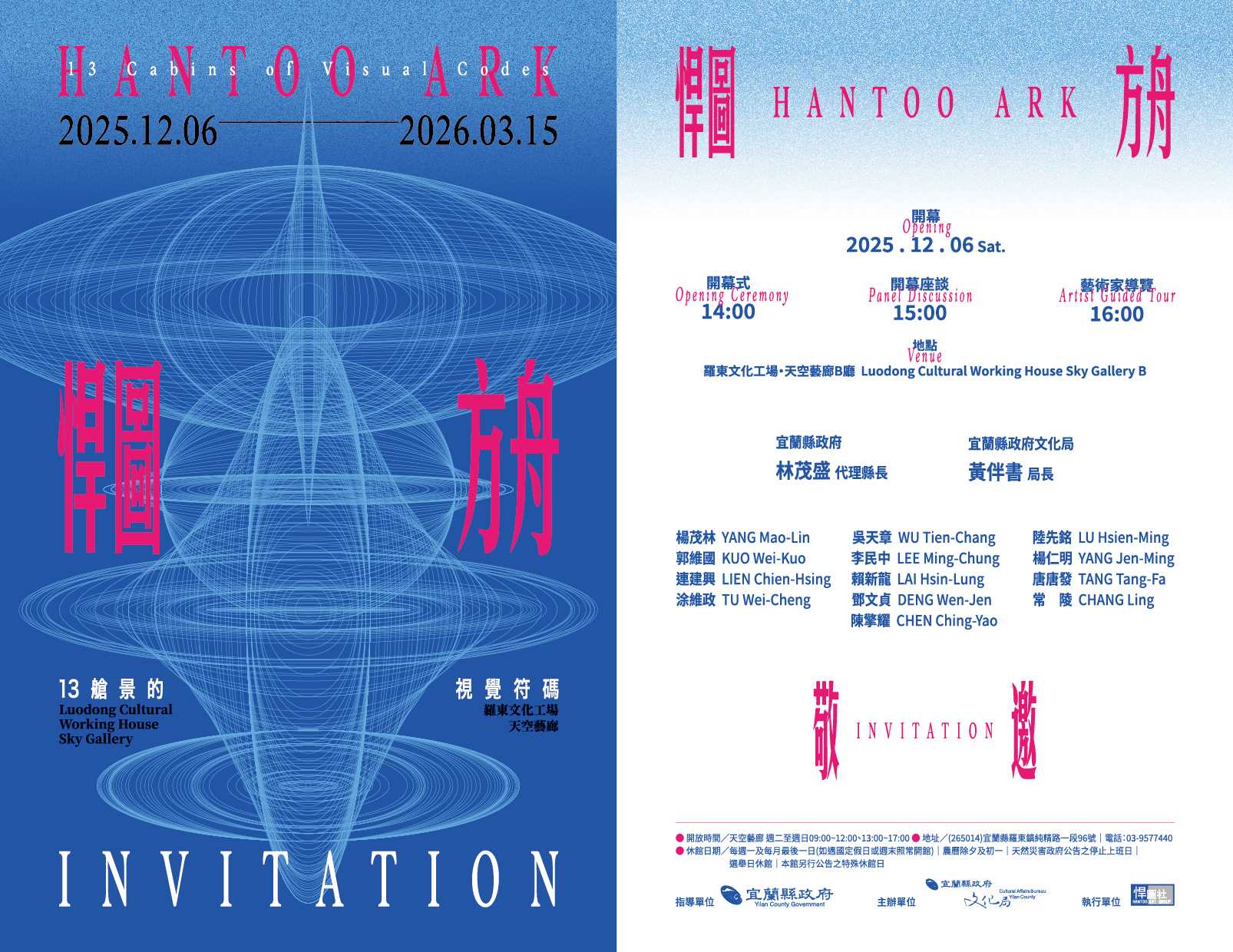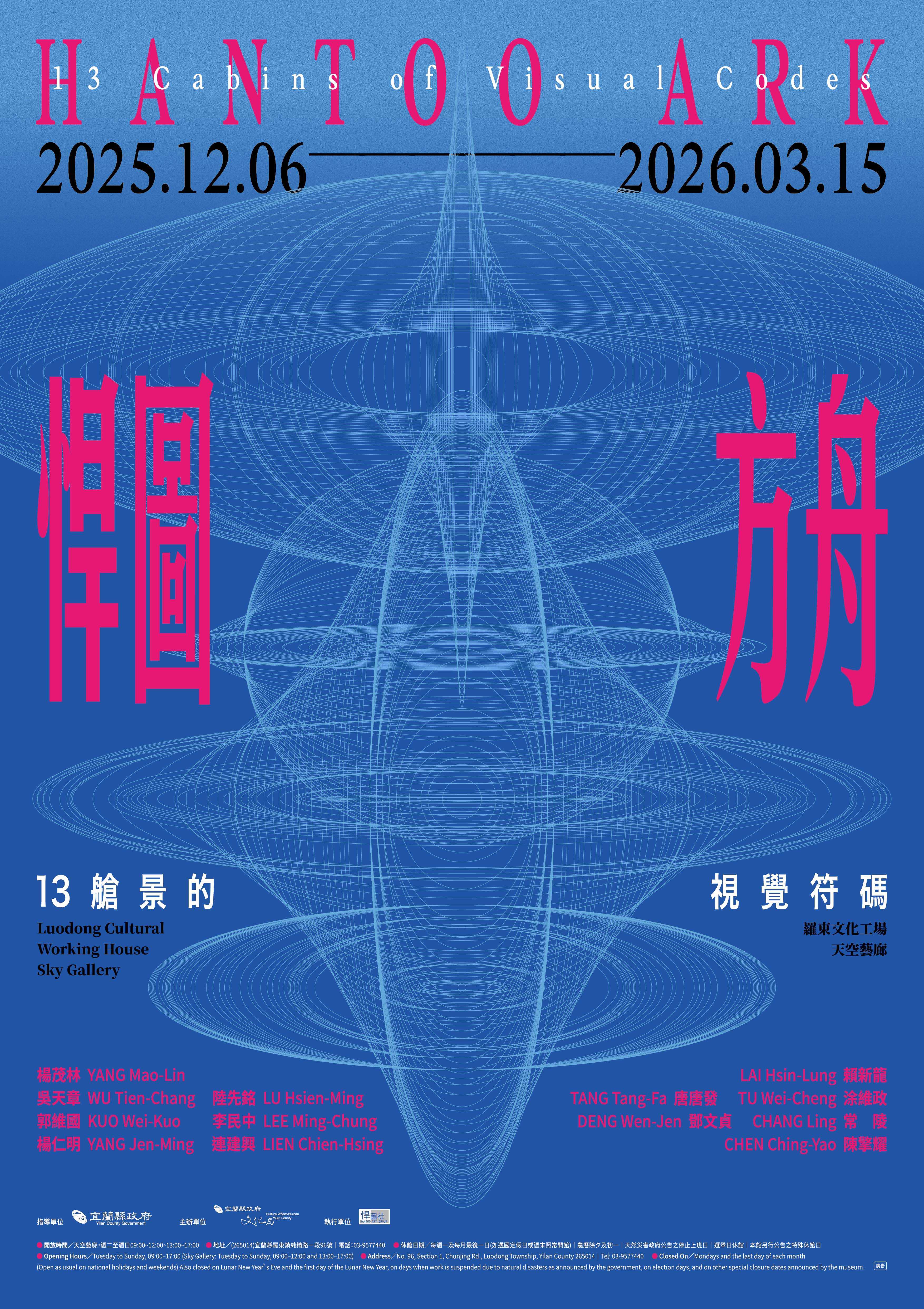 「悍圖方舟:13艙景的視覺符碼」展覽期間:114年12月6日(六)至115年3月15日(日)。開館時間:星期二至星期日:上午9時至12時、下午1時至5時;星期一及每月最後一日休館(逢國定假日照常開放)。 地點:宜蘭縣政府文化局羅東文化工場天空藝廊(宜蘭縣羅東鎮純精路1段96號2樓)。開幕式:114年12月6日(六)下午2時於羅東文化工場天空藝廊B廳舉行。 推廣活動:內容、時間及地點,將公布於宜蘭縣文化局網站及臉書:https://www.facebook.com/LuodongCWH。